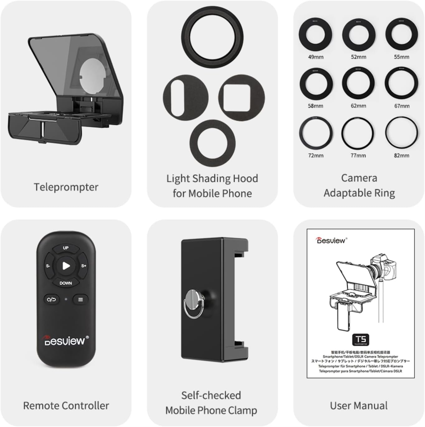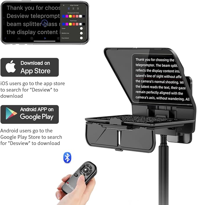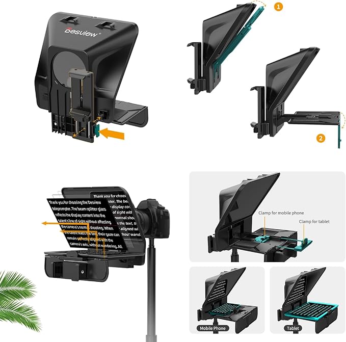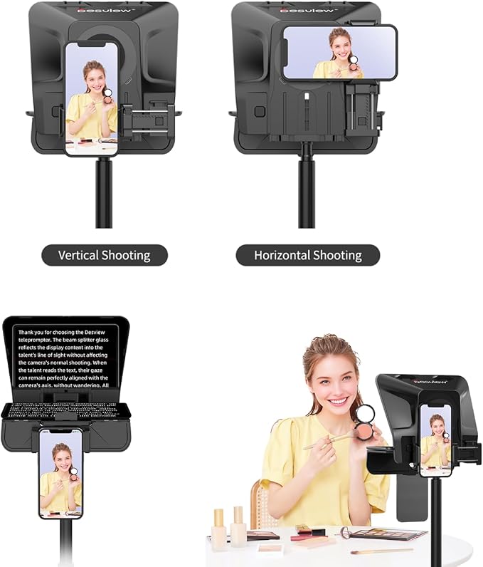 - Teleprompter universal para smartphone, tablet y cámara, El Desview T5 es un teleprompter versátil para SMARTPHONES, TABLETS, así como cámaras DSLR y MIRRORLESS.
