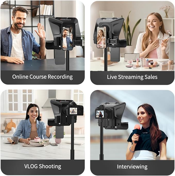 No arriesgue la calidad de su contenido, de la talla del estándar profesional invirtiendo en el Desview T5. Este dispositivo esencial elimina errores de guion al transformar su smartphone o tableta de hasta 8″ en un prompter con Cristal con Recubrimiento 26-capas, transparente e impecable. Su diseño ultra compacto con monturas de zapata fría y la base versátil garantizan el encuadre perfecto en cualquier lente, adaptándose a su DSLR o smartphone.