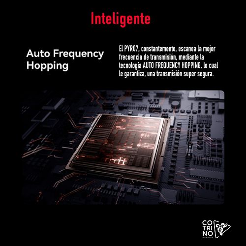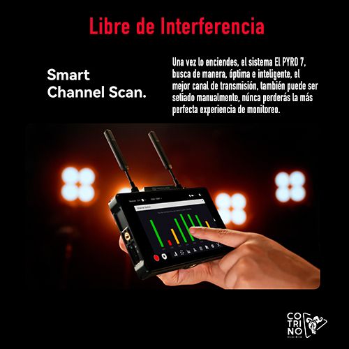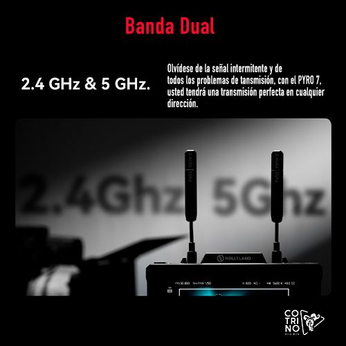 • Pyro 7 funciona en bandas duales de 2,4 GHz y 5 GHz y cuenta con salto automático de frecuencia inteligente, por lo que puede elegir automáticamente el canal más claro. Esta característica garantiza una transmisión de video inalámbrica confiable e ininterrumpida.