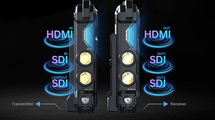 El transmisor ofrece una entrada HDMI, una entrada SDI y una salida de bucle SDI, y el receptor ofrece dos salidas SDI y una salida HDMI.